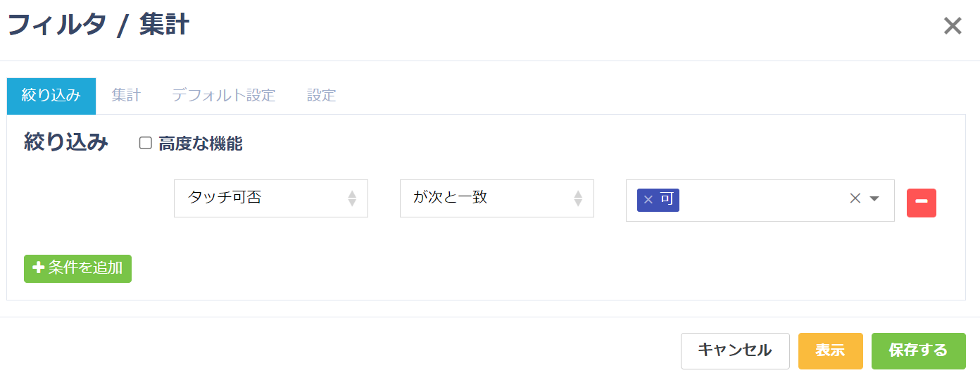 以下の例では、該当テーブルの「タッチ可否」の項目が選択式になっている前提で、その項目の値が「可」になっているレコードのみを絞り込みします。