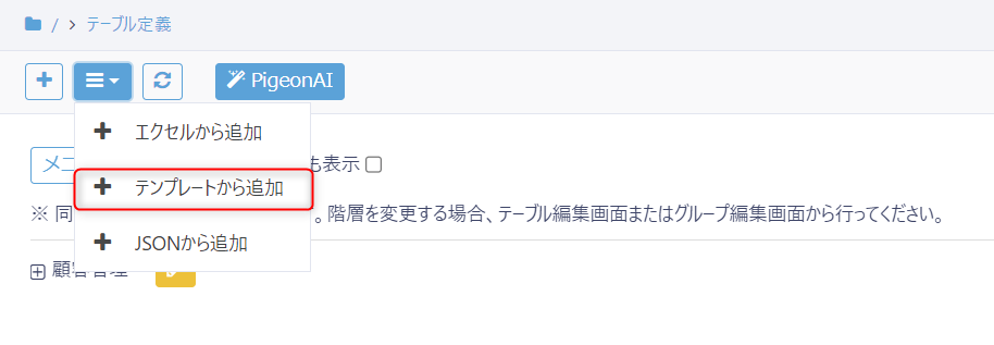 テーブル管理画面の左上アイコンから「テンプレートから追加」を選択します。