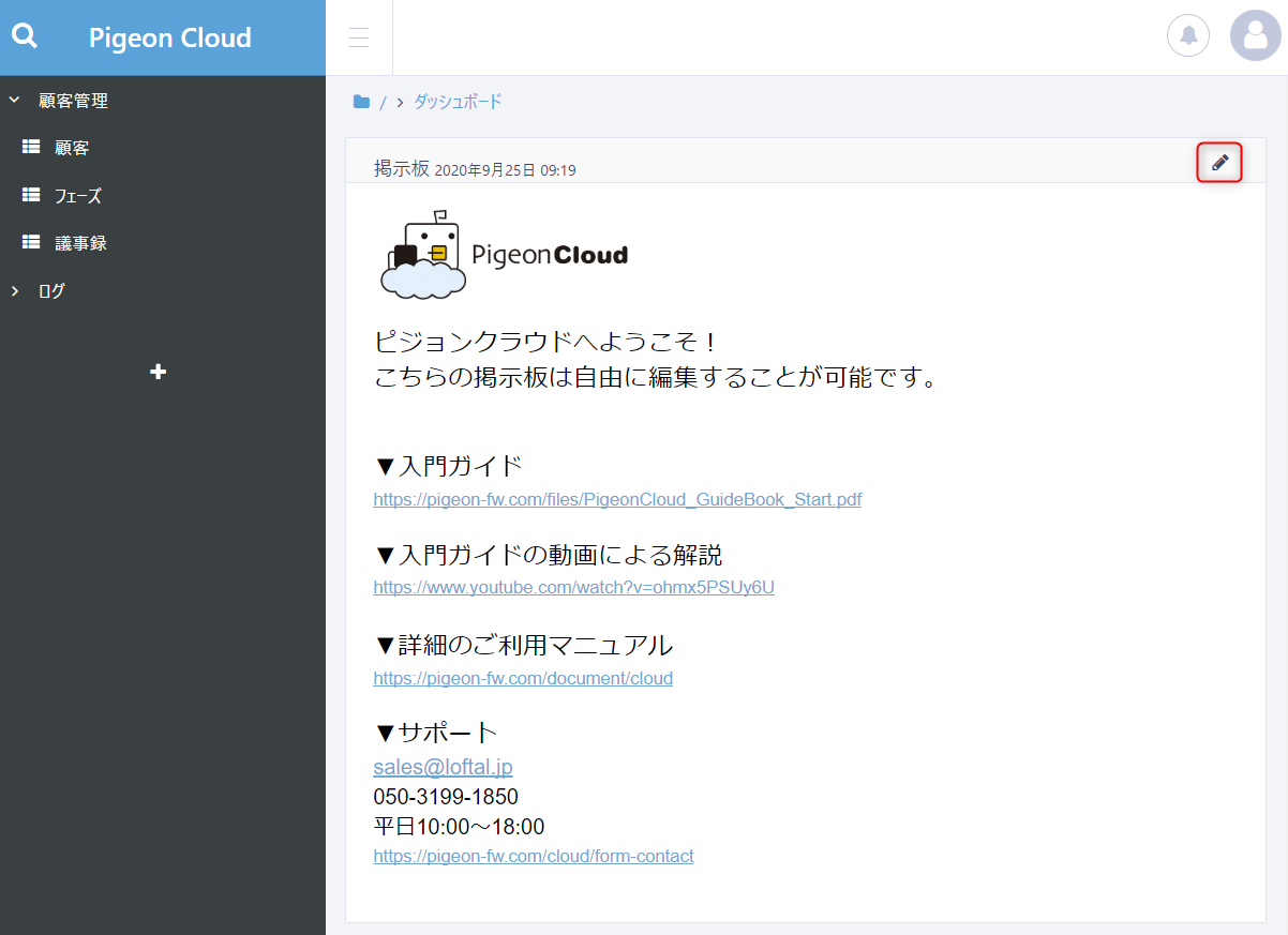 PigeonCloudでは、トップページに表示されるダッシュボードを設定することができます。