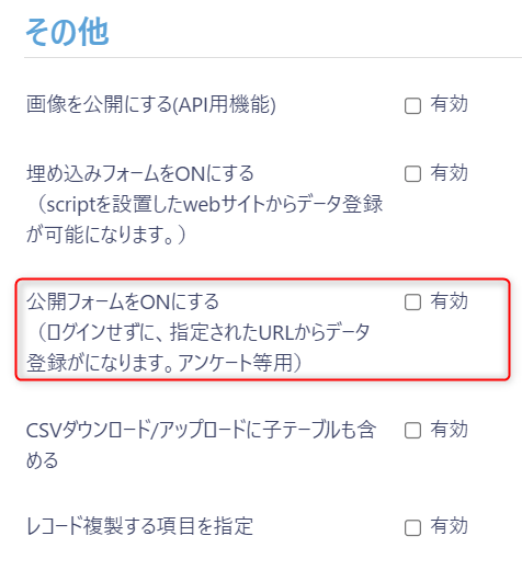 「公開フォームをONにする」欄に表示されている「有効」チェックボックスにチェックを入れます。