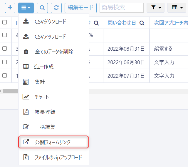 6.メニューから公開フォームリンクを選択する
