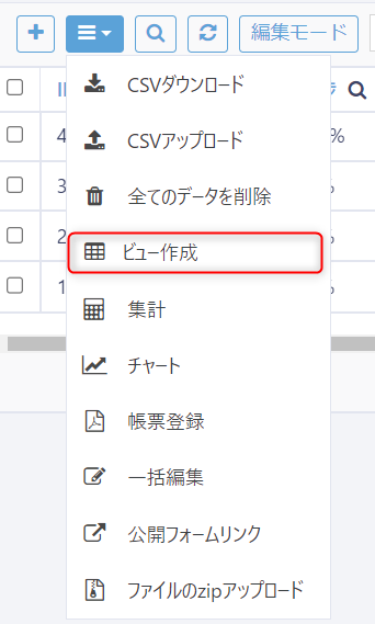 テーブルのレコード一覧のメニューより、「ビュー作成」をクリックします。