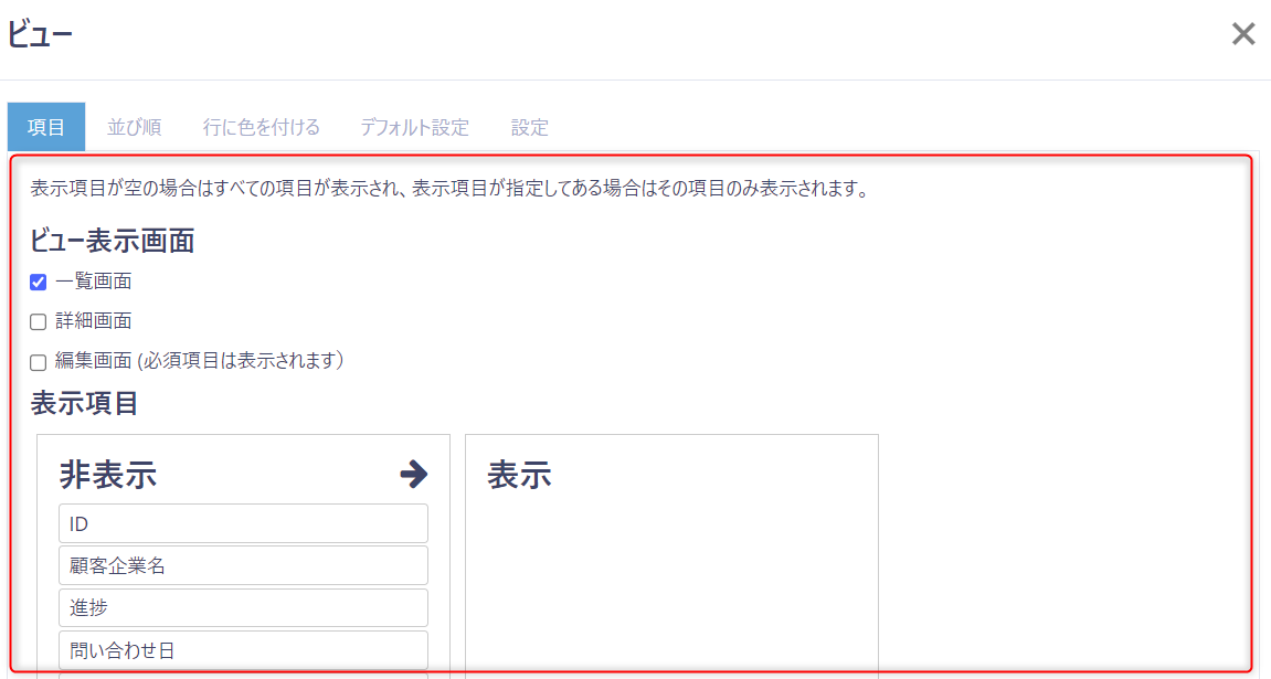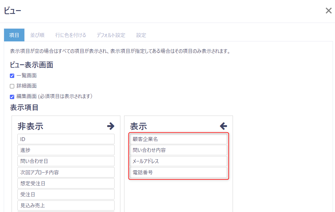 ビューで表示する項目を調整する画面が表示されます。
