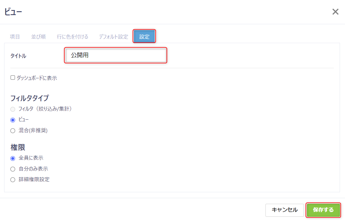 「設定」タブをクリックし、タイトル欄にビューのタイトルを入力し、「保存する」ボタンをクリックしビューを保存します。