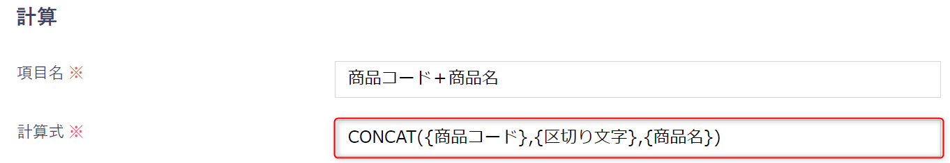 計算式:CONCAT({商品コード},{区切り文字},{商品名})
