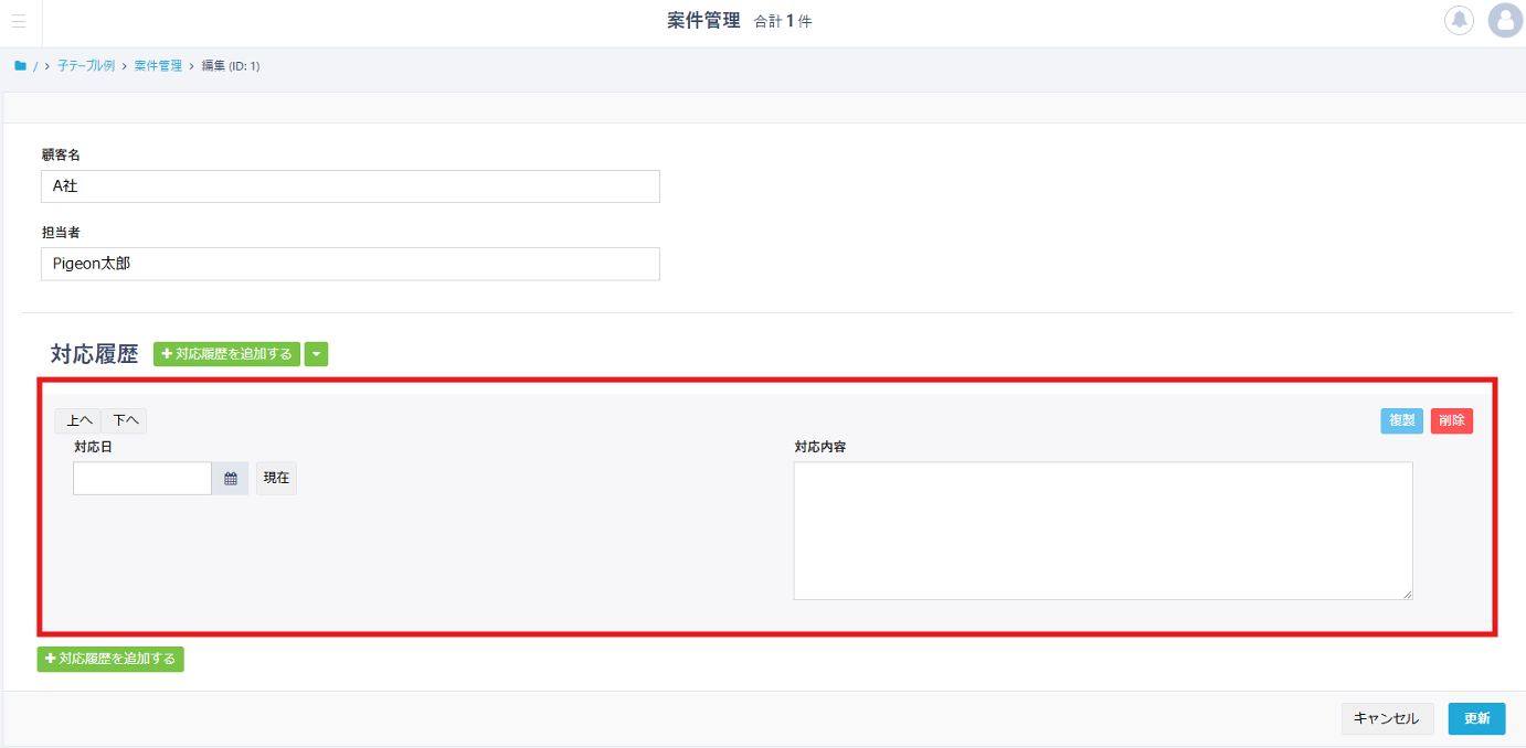 以下画面のようにレコード編集画面で子テーブルを設置する方法は、こちらのデモ動画からご確認いただけます。
