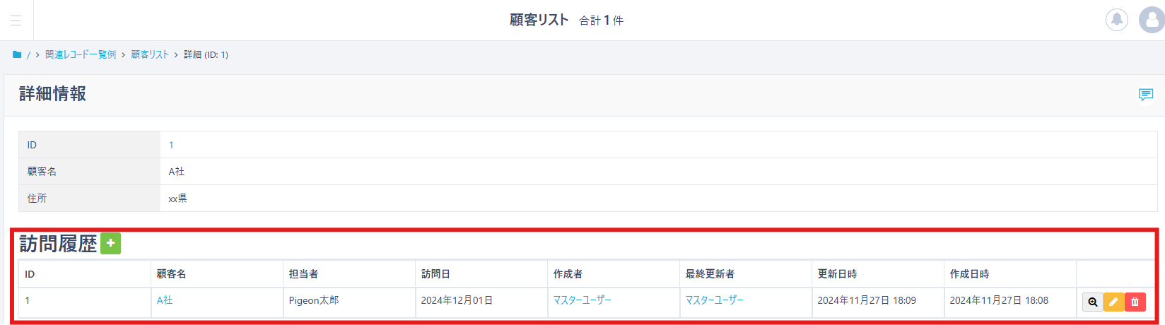 以下画面のようにレコード詳細情報画面で他テーブルのレコードを表示する方法は、こちらのデモ動画からご確認いただけます。